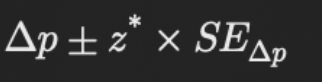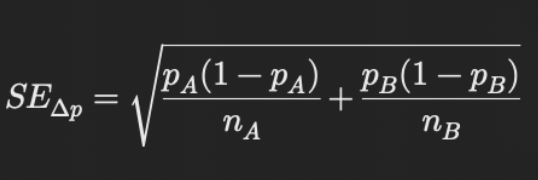 신뢰구간은 먼저, 두 그룹 간의 차이(여기선 단순 % 간의 절대적 차이인 %p로 가정)를 구하고 그 다음 표준오차를 계산한다. 그 다음 임계값을 정한 후 신뢰구간을 계산한다.
