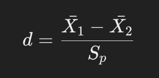 - 두 그룹 간 평균 차이를 표준편차로 나눈다. (표준편차는 두 그룹의 표준편차의 풀링 값)