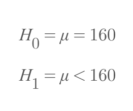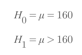 이번에는 대립가설이 'A 학급의 평균 키는 160cm보다 작다'라고 해보자. 이를 좌측검정이라고 한다. 반대로 이번엔 'A 학급의 평균 키는 160cm보다 크다'라고 하자. 이를 우측검정이라고 하며 수식은 아래와 같다. 단측검정의 기각역은 5%(0.05)다.