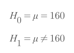 A라는 학급의 평균 키가 160cm이라는 최초의 가설이 있다고 가정하자. 이는 귀무가설이다. 수식으로 표현하면 위의 첫 번째 식과 같다. 이에 대한 대립가설, 즉 우리가 검증하고 싶은 가설은 'A 학급의 평균 키는 160cm가 아니다'라고 해보자. 이를 수식으로 나타내면 위의 두 번째 식과 같다. 양측검정에서는 좌우로 각각 2.5%(0.025)의 기각역(귀무가설이 부정되는 영역)이 설정된다.