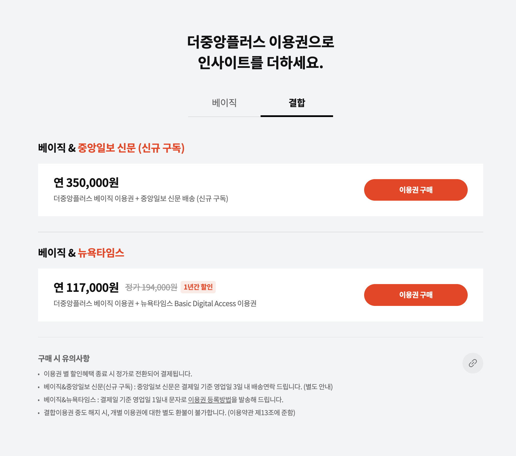 위 화면은 구독제를 구매할 수 있는 페이지이다. 구매할 수 있는 이용권 상품은 크게 '베이직', '신문 독자 전용', '결합'으로 구성되어 있다.